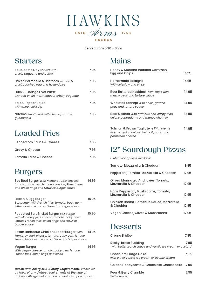Our dinner menu brings together quality ingredients, rich flavours and warm hospitality. From traditional pub favourites to chef-crafted specials, every dish is cooked with care to make your evening memorable.